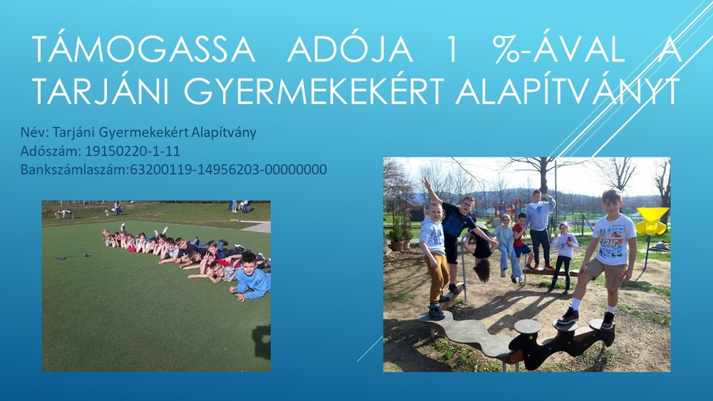 A Miniszterelnökség Egyházi és Nemzetiségi Kapcsolatokért Felelős Államtitkársága a "Tarjáni Német Nemzetiségi Általános Iskola energiahatékonyságot elősegítő köznevelési célú beruházásának támogatása" célra előleg formájában 10.000.000,- Ft vissza nem térítendő támogatást biztosít.