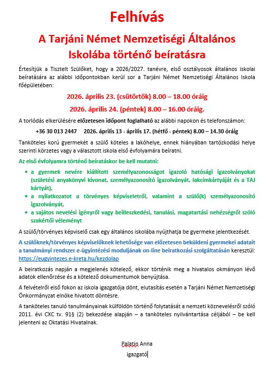 A Tarjáni Német Nemzetiségi Általános Iskola a Bethlen Gábor Alapkezelő Zrt. által kiírt