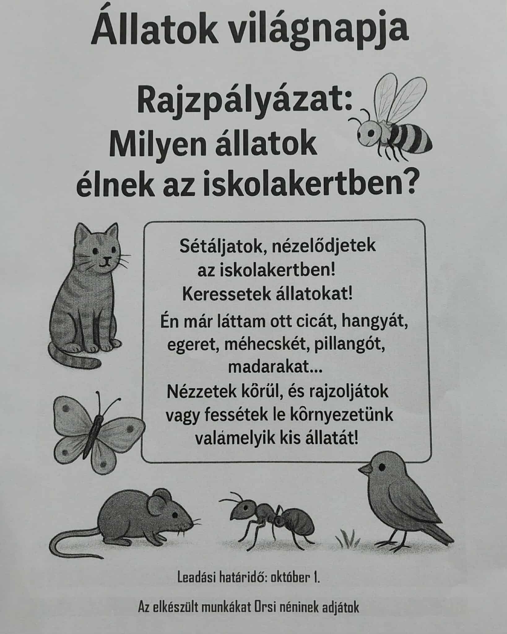 Az Állatok világnapja alkalmából mese- és versíró-, valamint rajz pályázatot hirdetünk.