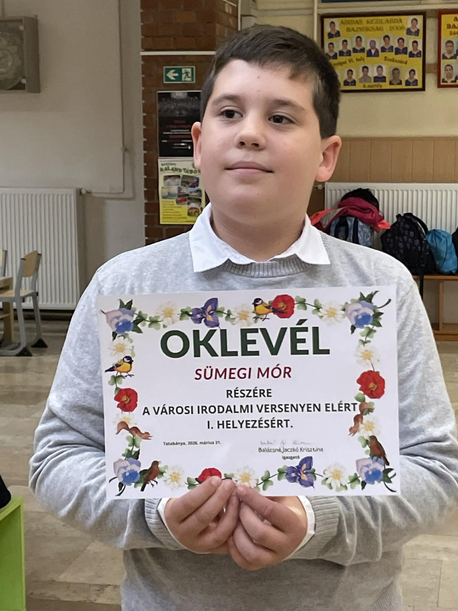 Sümegi Mór a Kodály iskolában a Tündérboszorkány - irodalmi vetélkedőn egyéni versenyben I. helyezést ért el.