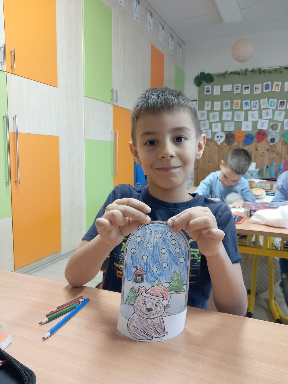majd vágással, ragasztással, színezéssel térbeli medvét is készítettek. Az 1.b osztályosok otthonról